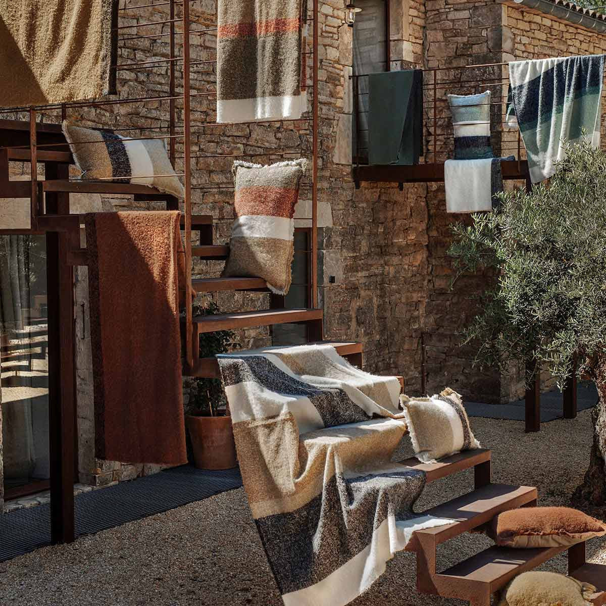 De gestreepte plaid CALYPSO van Haomy is het ideale accessoire om een vleugje grafische stijl en warme comfort toe te voegen aan je ontspanningsmomenten. De contrasterende strepen, de franjes en het levendige kleurenpalet maken het een bondgenoot voor je gezellige avonden.