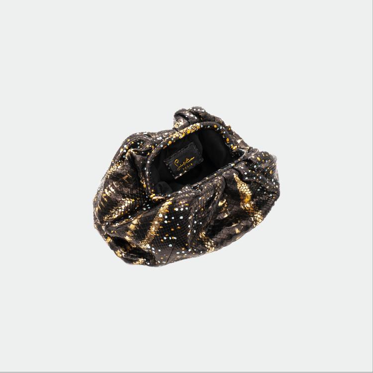 Pochette souple en python, avec doublure intérieure en coton et fermeture magnétique. Compartiment unique avec petite poche. Finitions métalliques. Bandoulière amovible en python.