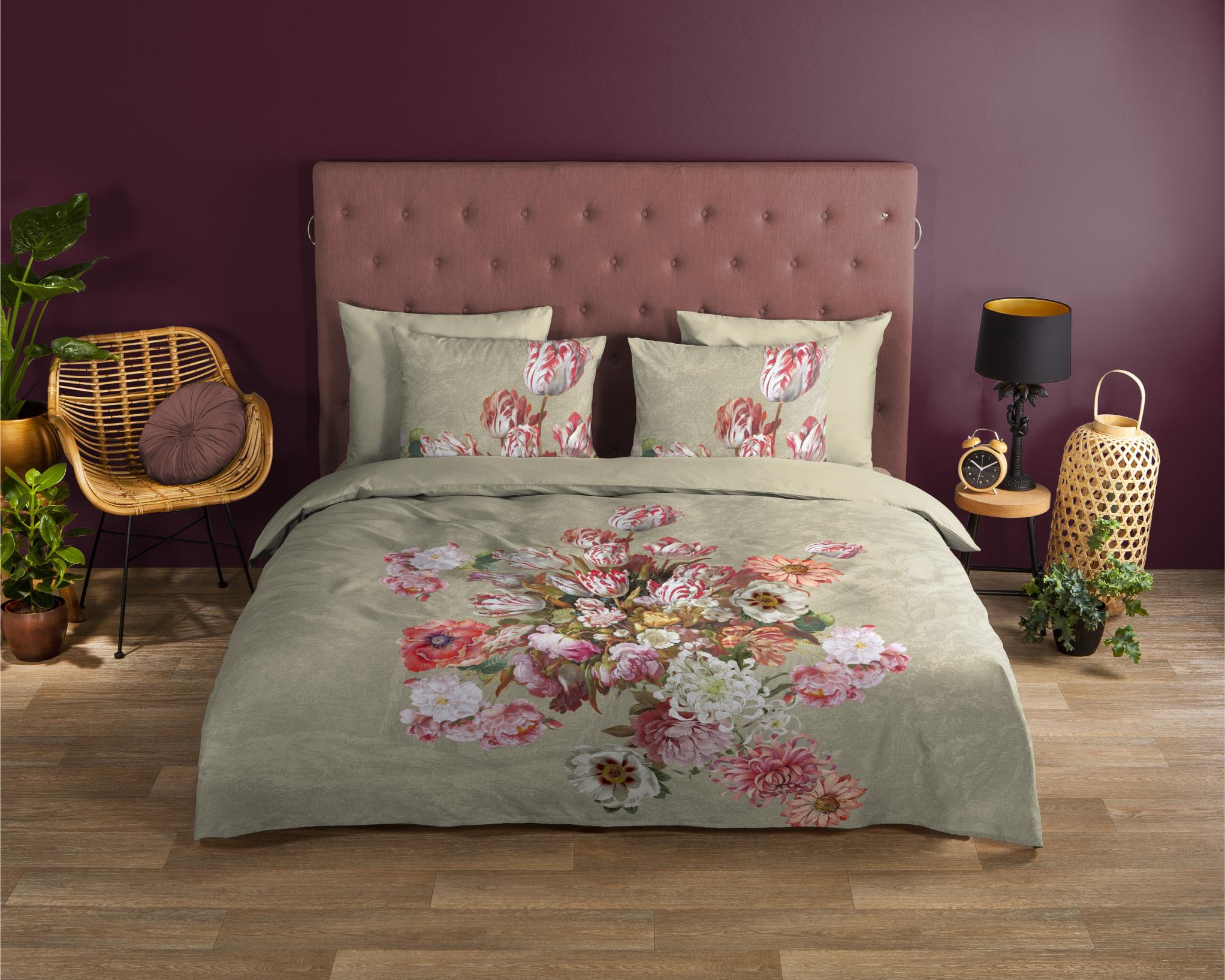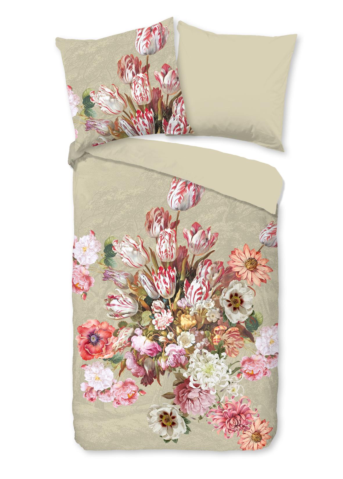 Housse de couette Miran de Good Morning avec des fleurs, en couleur sable. Elle est fabriquée à 100% en coton. La qualité est respirante, absorbante et se sent douce et souple. Cette belle housse de couette égaye chaque chambre et convient à toutes les saisons. La housse de couette en coton est délicieusement fraîche en été et procure de la chaleur en hiver. L'ensemble se compose d'une housse de couette incluant une taie d'oreiller avec fermeture hôtelière. La housse de couette est dotée d'une double bande de boutonnage continue. Cet article est certifié Oeko-Tex (Oeko-Tex Standard 100) : exempt de substances nocives et respectueux de la peau. Lavable à max. 40°C et adapté au sèche-linge.