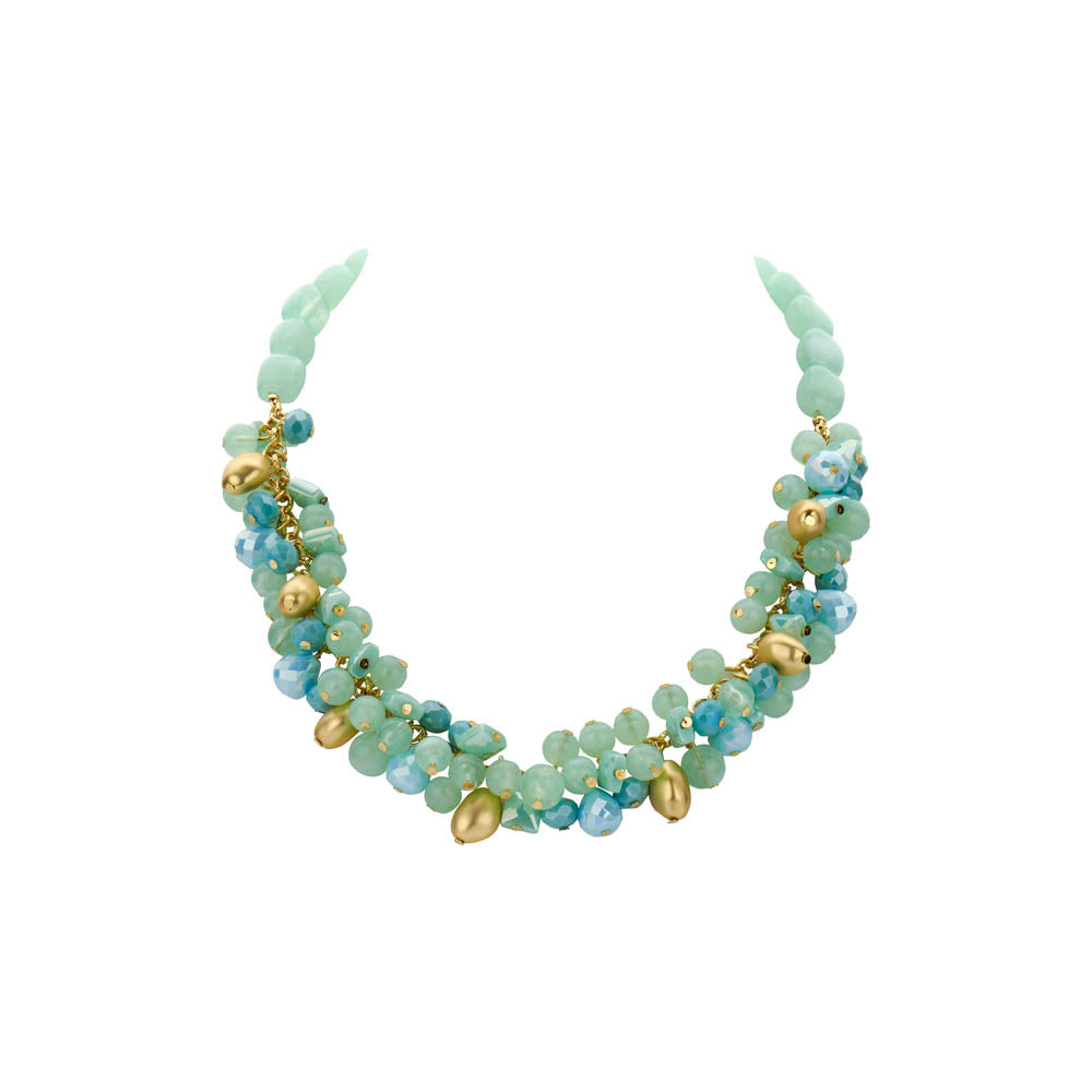Collier de style bohème avec des perles vertes d'eau en faisceau et des accents dorés