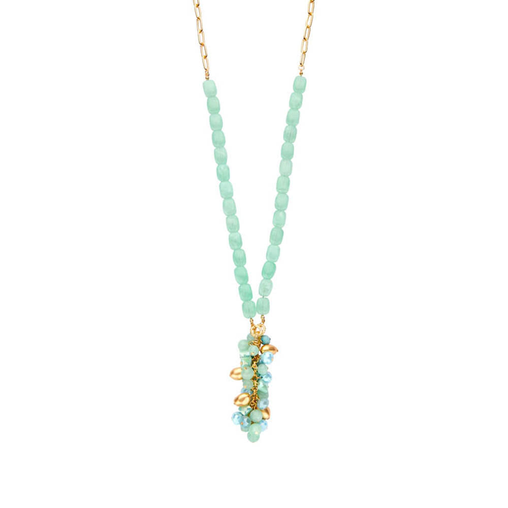 Sautoir de style bohème, pendentif de perles vert d'eau en faisceau avec des accents dorés