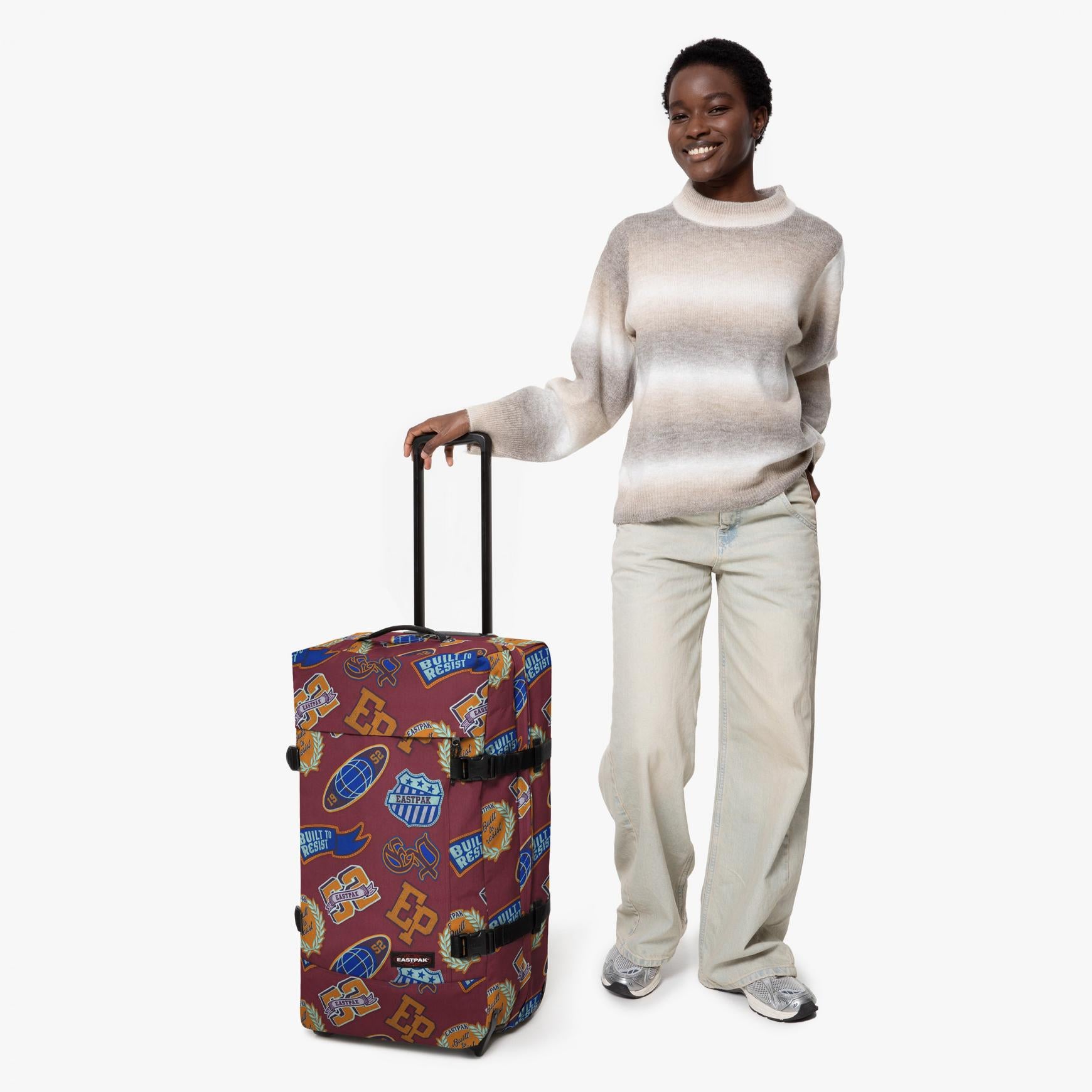 Vintage kleuren contrasteren met graphics in collegestijl in onze retrocollectie. Onze klassieke middelgrote tas heeft een systeem met dubbele wieltjes en dubbele vakken voor een weekje weg en langere vakanties.