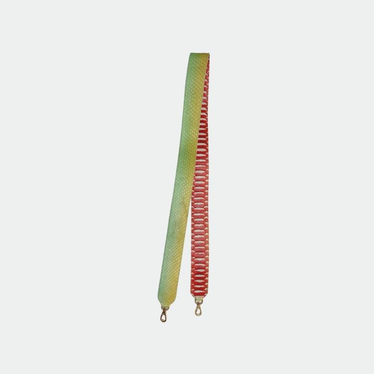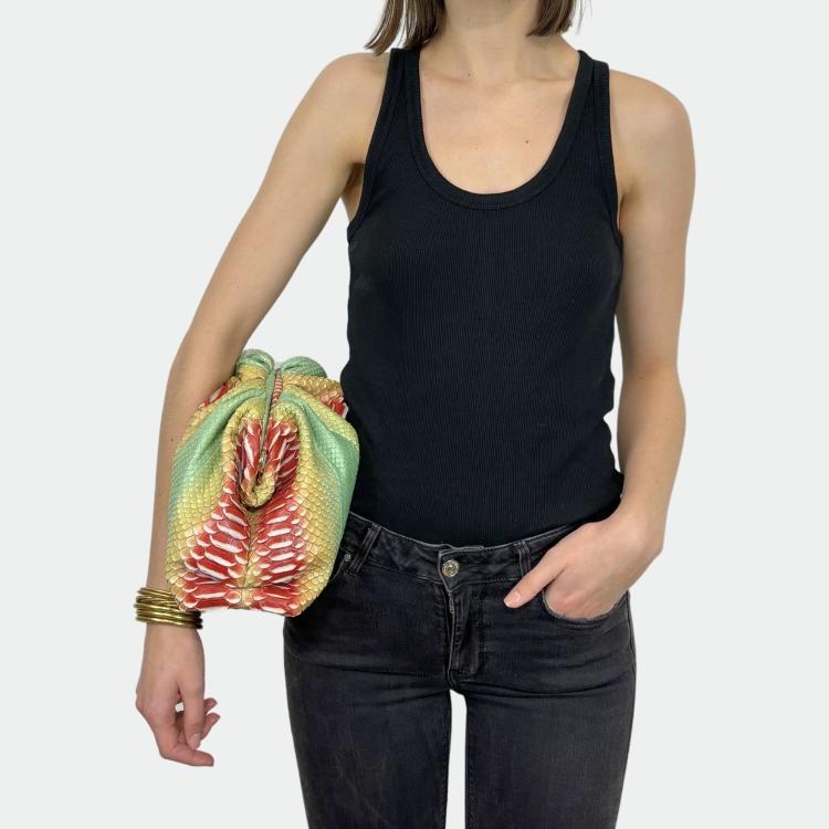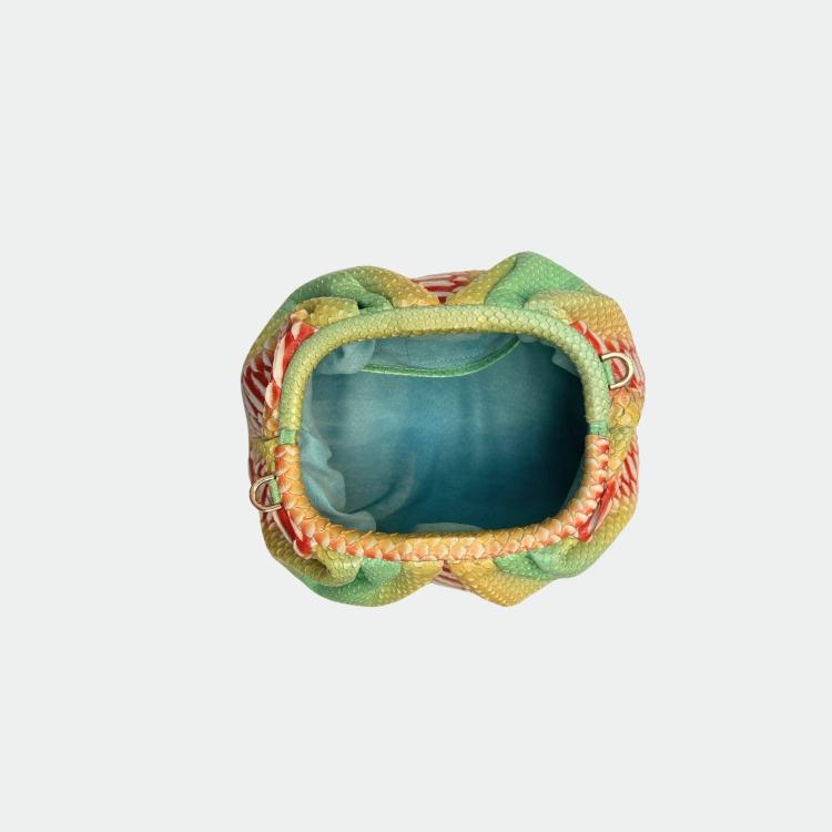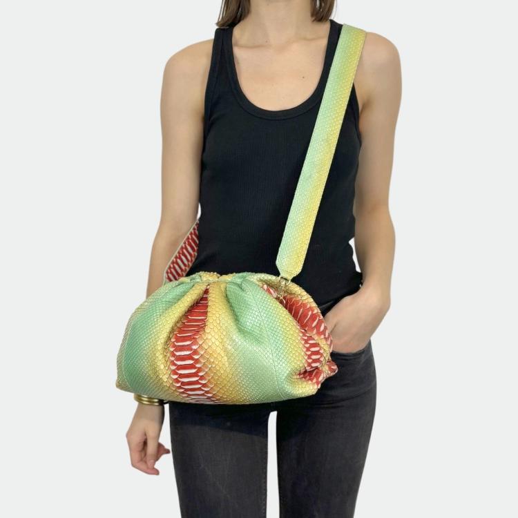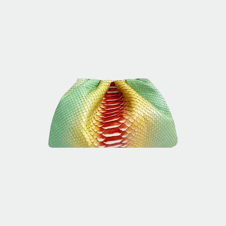 Zachte tas van python, met katoenen voering en magnetische sluiting. Enkel compartiment met klein zakje. Metalen afwerkingen. Afneembare schouderriem van python.