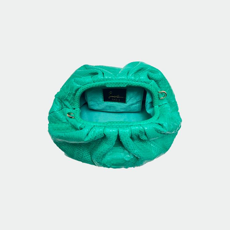Zachte tas van python, met katoenen voering en magnetische sluiting. Enkel compartiment met klein zakje. Metalen afwerkingen. Afneembare schouderriem van python.