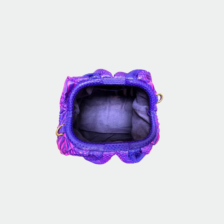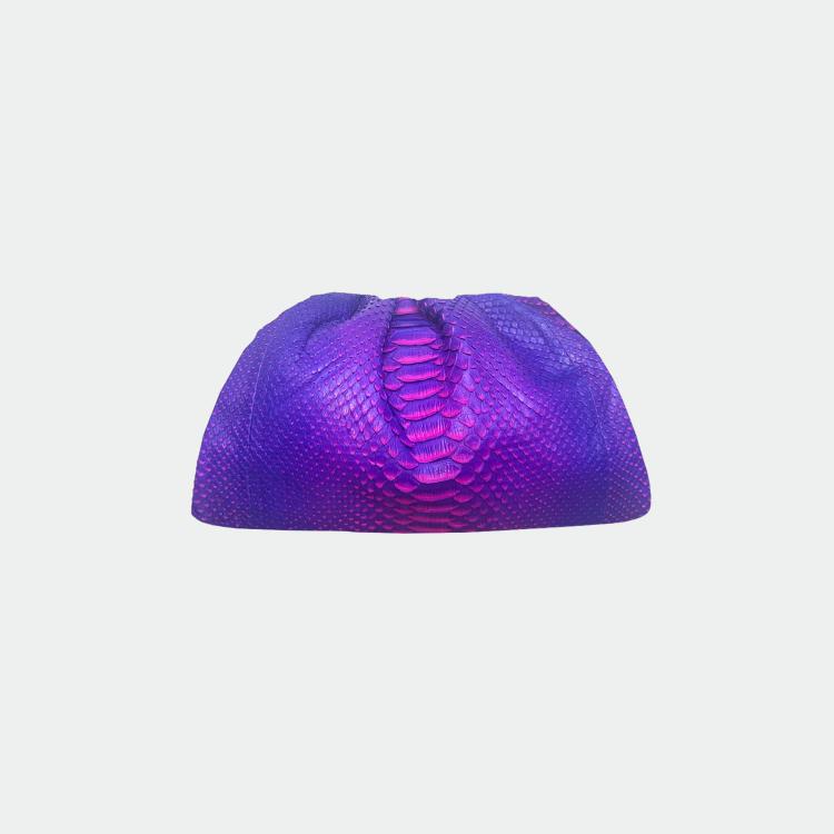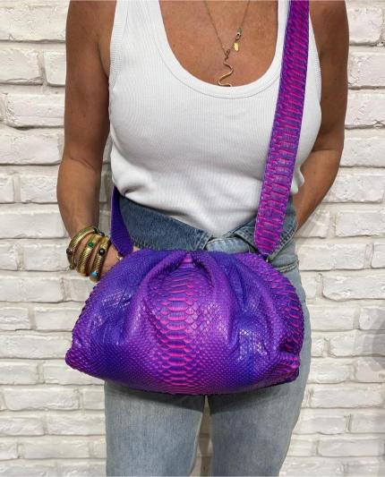 Zachte tas van python, met katoenen voering en magnetische sluiting. Enkel compartiment met klein zakje. Metalen afwerkingen. Afneembare schouderriem van python.