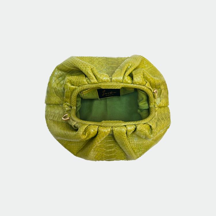 Zachte tas van python, met katoenen voering en magnetische sluiting. Enkel compartiment met klein zakje. Metalen afwerkingen. Afneembare schouderriem van python.