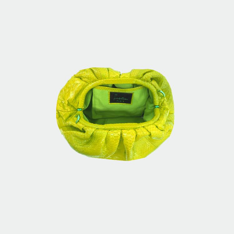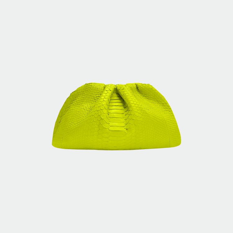 Zachte tas van python, met katoenen voering en magnetische sluiting. Enkel compartiment met klein zakje. Metalen afwerkingen. Afneembare schouderriem van python.