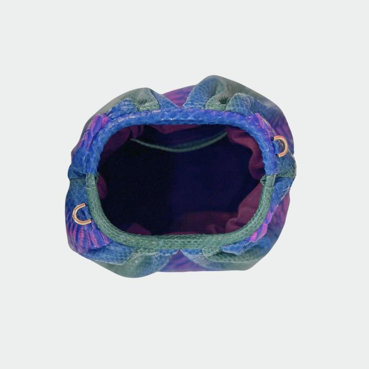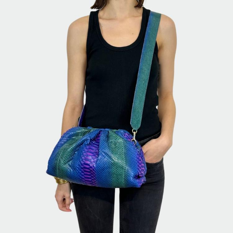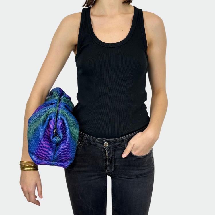 Zachte tas van python, met katoenen voering en magnetische sluiting. Enkel compartiment met klein zakje. Metalen afwerkingen. Afneembare schouderriem van python.