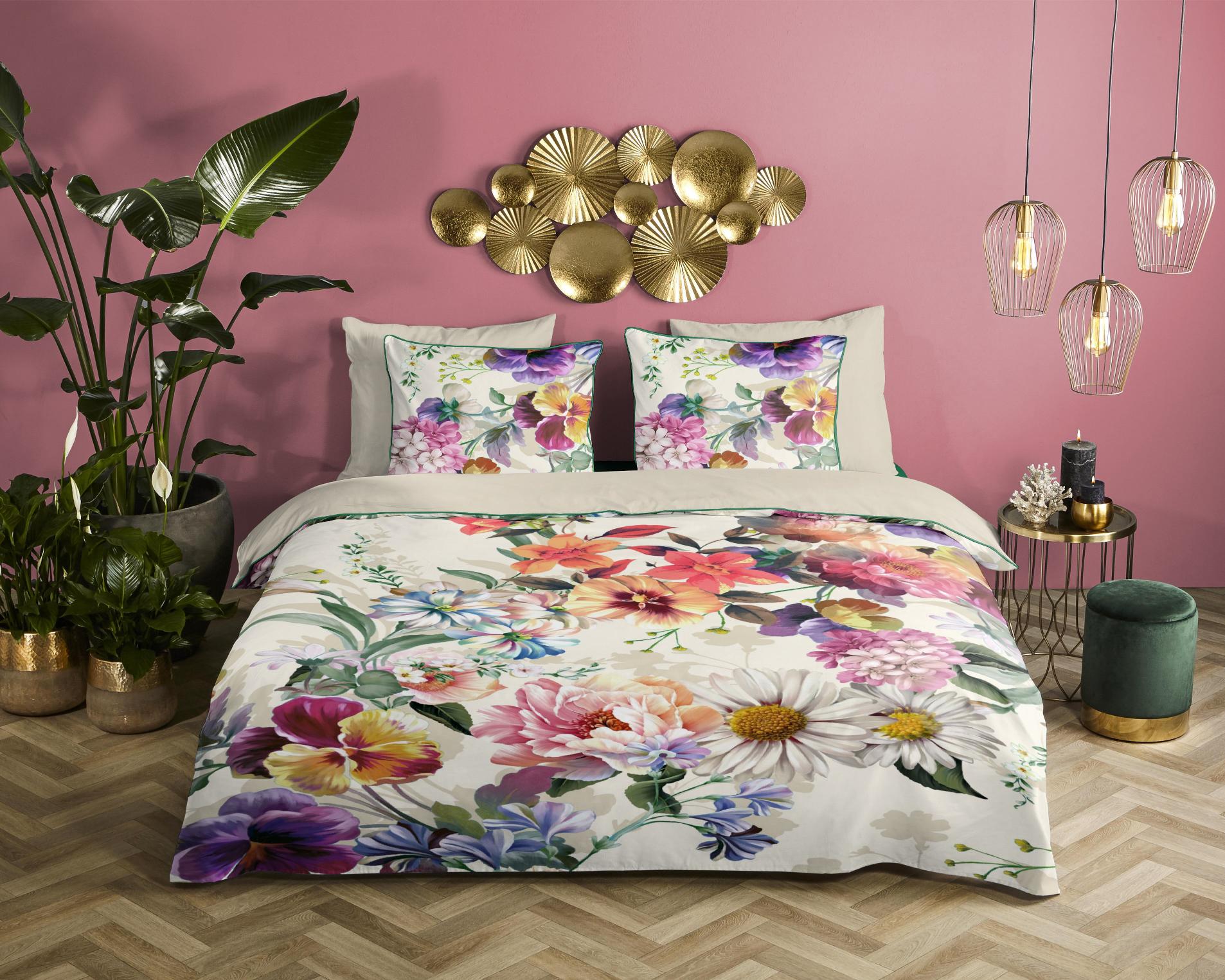 Satijnen dekbedovertrek Novara van Descanso. Dit dekbedovertrek met bloemen, in de kleur ecru, is gemaakt van 100% katoen-satijn. Descanso dekbedovertrek is luxe, stijlvol en elegant. De achterkant heeft een bijpassende uni kleur. Het dekbedovertrek en de kussenslopen zijn afgewerkt met een luxe bies in een bijpassende kleur. Dat geeft een chique uitstraling aan je slaapkamer. Het dekbedovertrek van Descanso is gemaakt van 100% organisch katoen-satijn. Satijn is een speciale weeftechniek die zorgt voor een mooie glans en een zachte, soepele stof. Het is ademend, vocht- en warmteregulerend, en dus heerlijk comfortabel. Oeko-Tex gecertificeerd: vrij van schadelijke stoffen. Wasbaar op max. 60°C en geschikt voor de wasdroger.