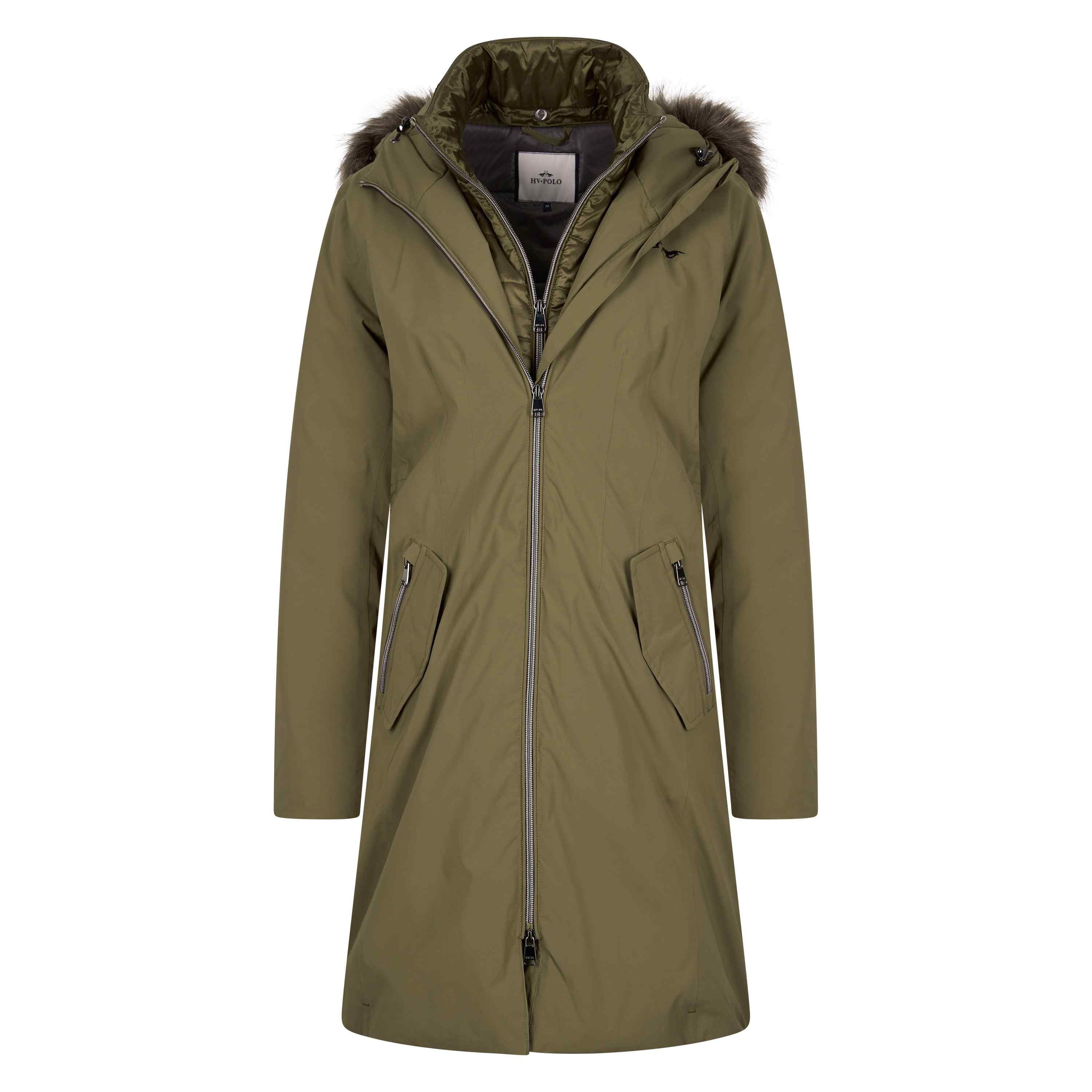 Elegante medium gewatteerde parka * Hoge kraag * Luxe bont rondom capuchon * Uitneembare binnenjas in parelglansstof * Verstelbare capuchon * Volledig getapete naden * Waterafstotend * Winddicht * 2-weg ritssluiting aan de voorkant * Merkritstrekkers * Contrasterende voering * Fakedown label glanzend gedrukt aan de binnenkant van de jas op de voering * Fijne rib binnenmanchetten * Kinbeschermer * Voorzakken met klep en ritsen * Zijsplitten met blinde drukknoopsluitingen * Binnenzak met rits * HV Polo Logo in metallic gedrukt op de linkerborst van de drager * Zwarte metalen accessoires * Metalen paardenplaat op de bovenmouw van de linkerdrager