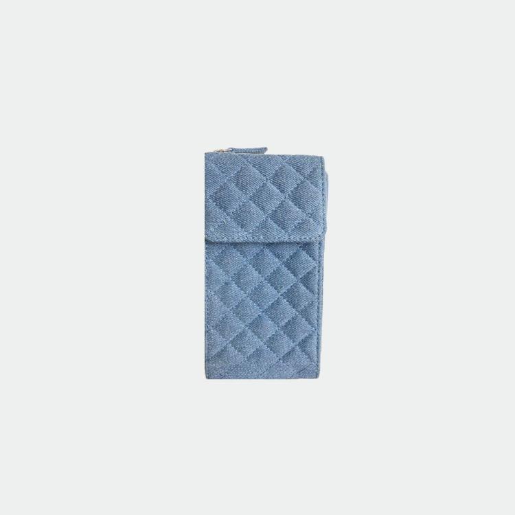 Denim tas, met dubbel compartiment: portemonnee compartiment entelefoon compartiment. Metalen afwerkingen in de kleur zwart. Afneembare schouderriem indenim en metaal.Afmetingen van de tas: 17,5 x 10 cm