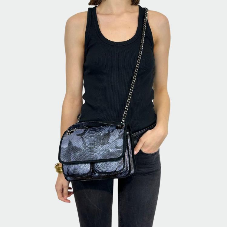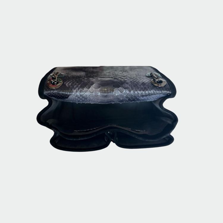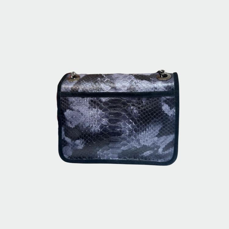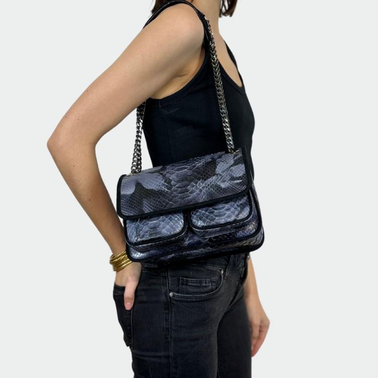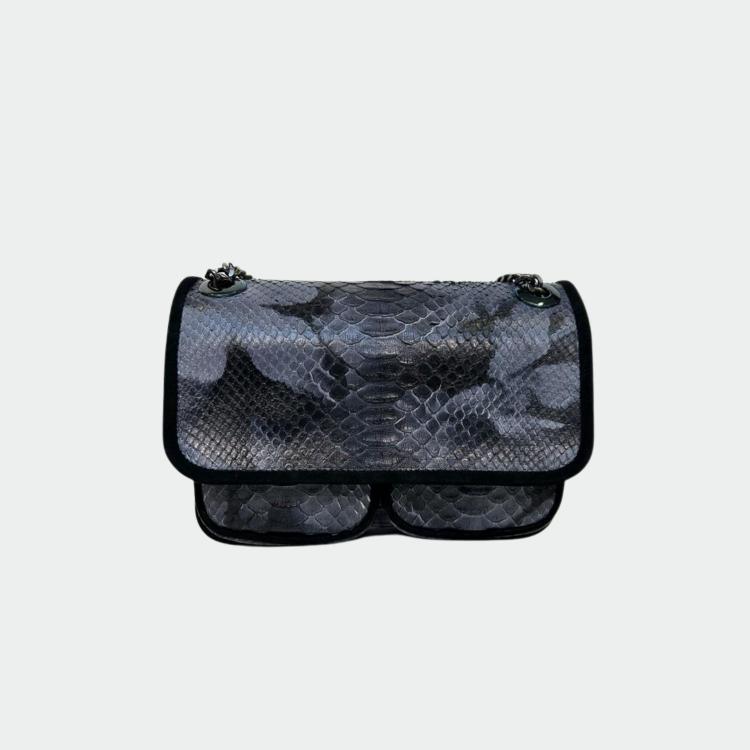 Tas in python, met katoenen voering en handvatten in python en leer. Een hoofdvak met een klein zakje en twee andere compartimenten. Metalen schouderriem.