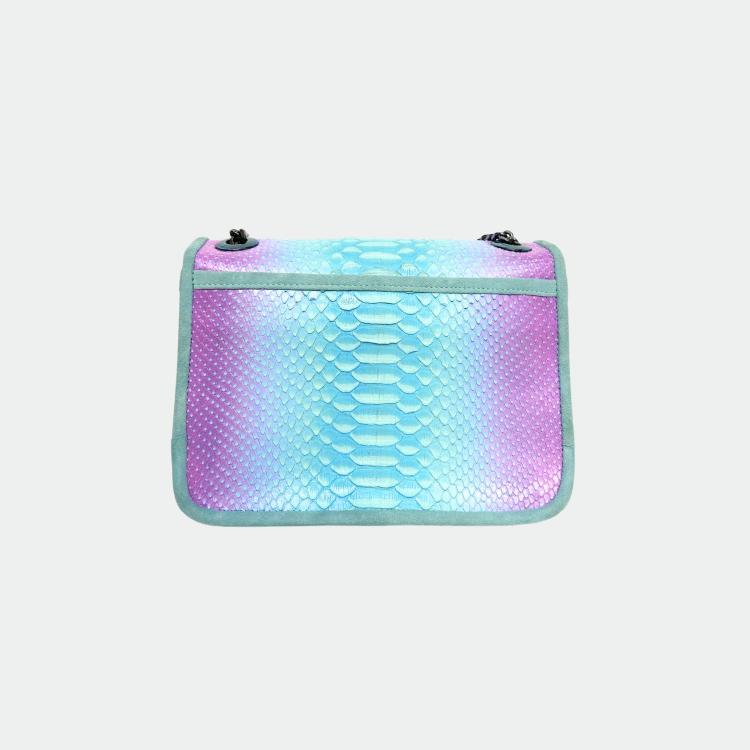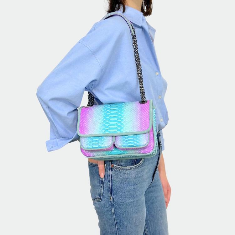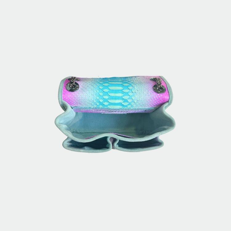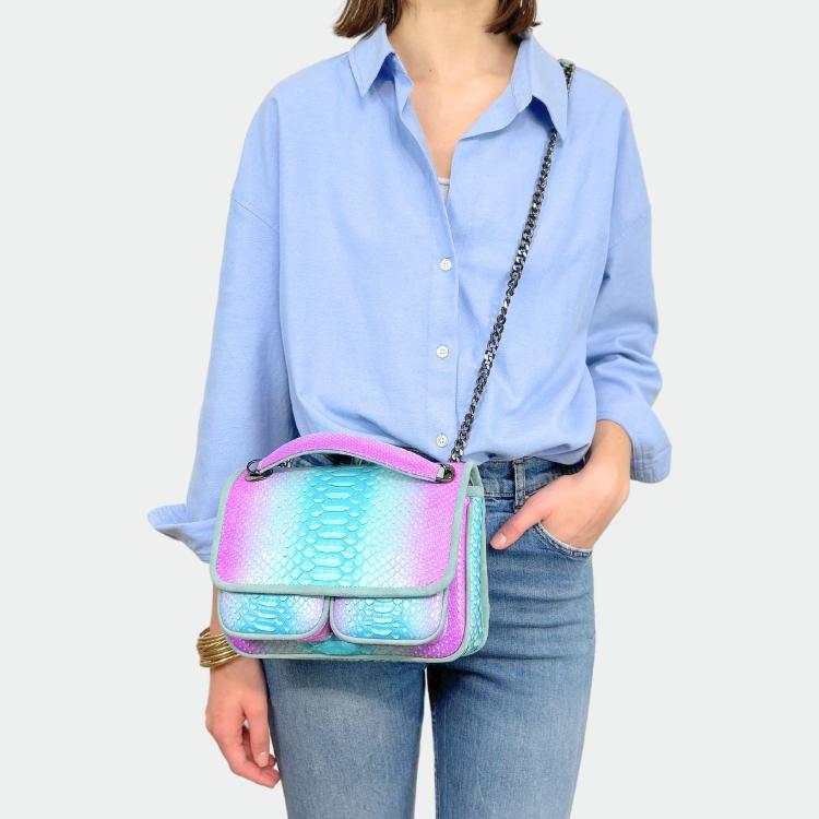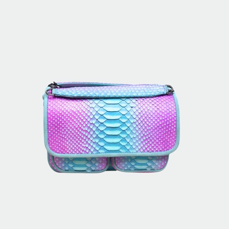 Tas in python, met katoenen voering en handvatten in python en leer. Een hoofdvak met een klein zakje en twee andere compartimenten. Metalen schouderriem.