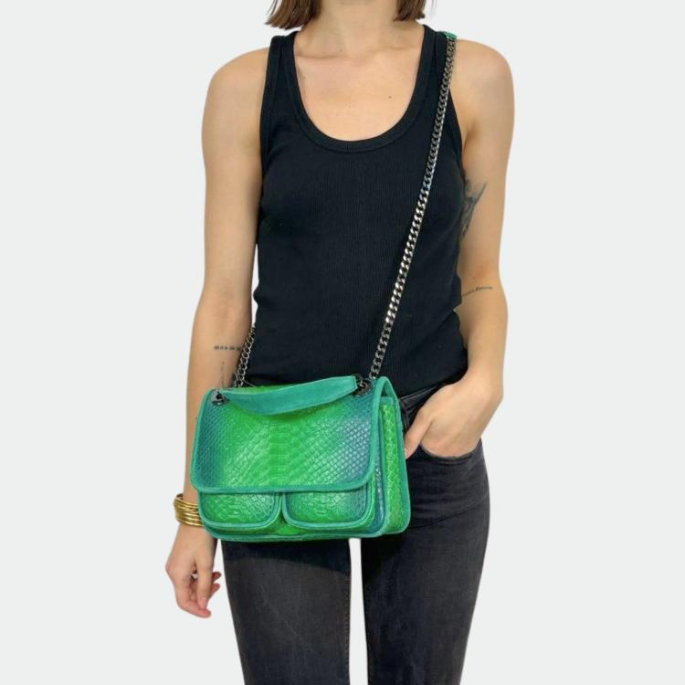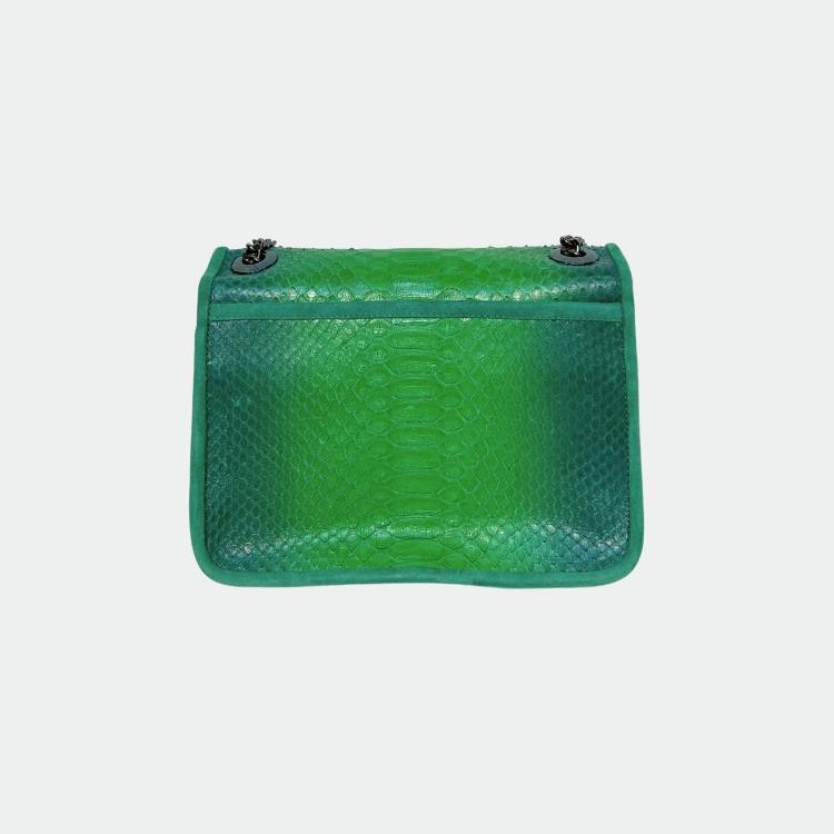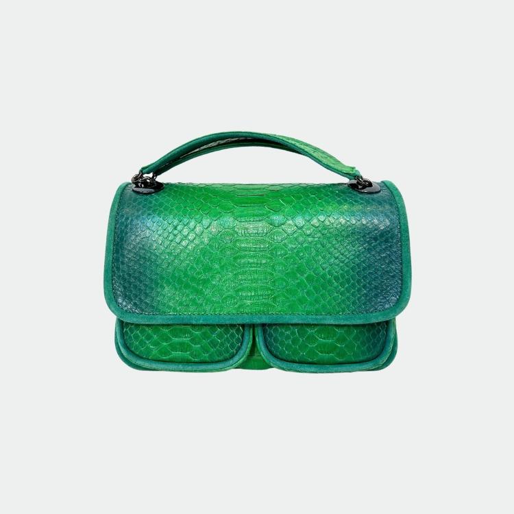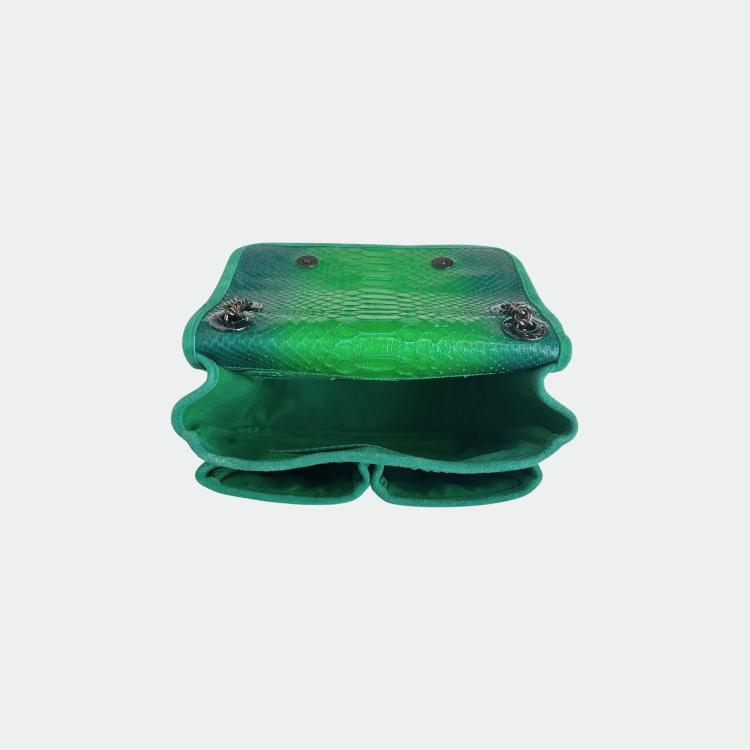 Tas in python, met katoenen voering en handvatten in python en leer. Een hoofdvak met een klein zakje en twee andere compartimenten. Metalen schouderriem.