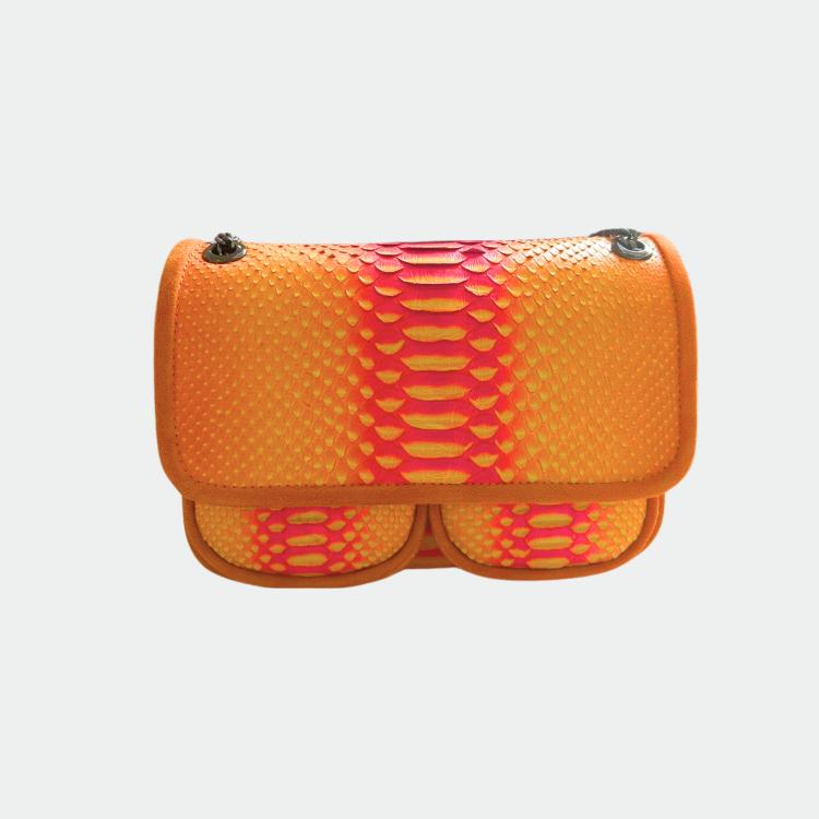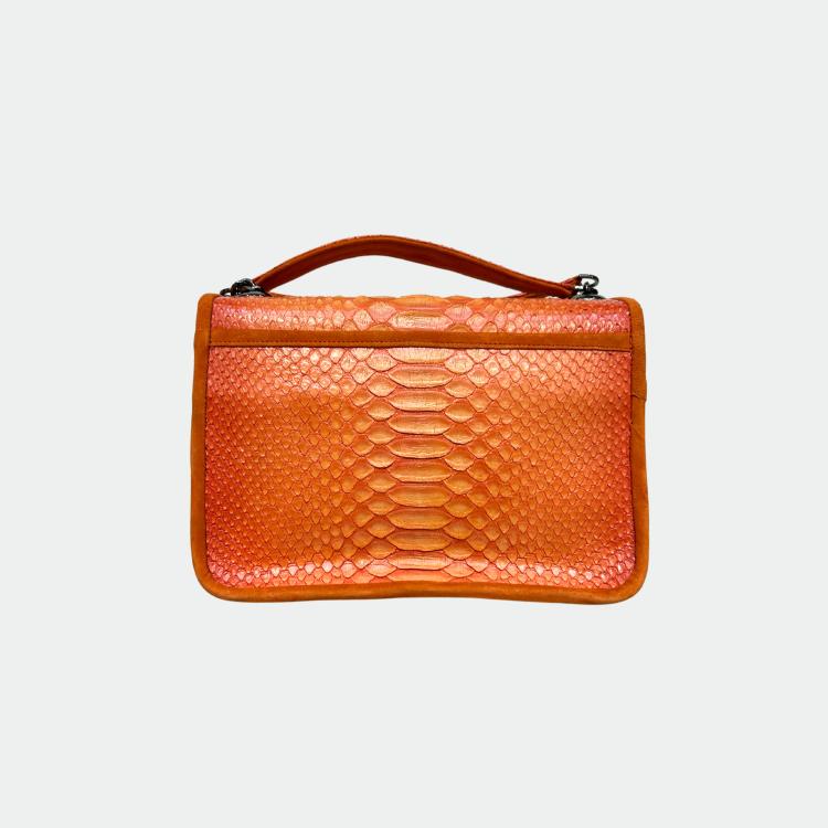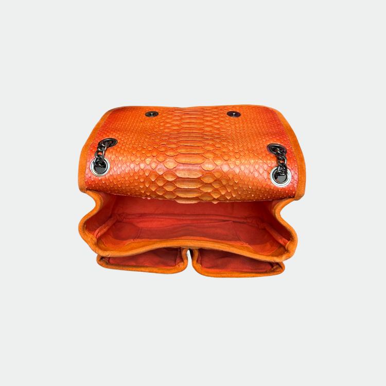Tas in python, met katoenen voering en handvatten in python en leer. Een hoofdvak met een klein zakje en twee andere compartimenten. Metalen schouderriem.