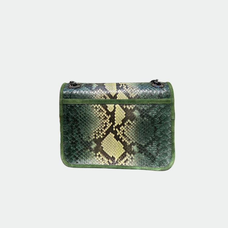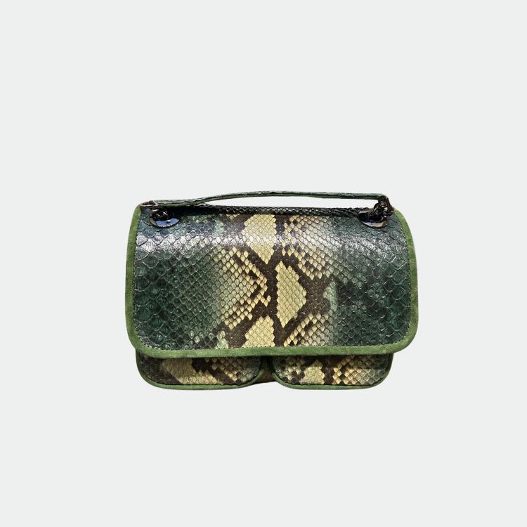 Tas in python, met katoenen voering en handvatten in python en leer. Een hoofdvak met een klein zakje en twee andere compartimenten. Metalen schouderriem.